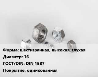 Гайка шестигранная, высокая, глухая D=16 DIN 1587 оцинкованная, шт цена от 10.32 ₽ / кг, где купить, условия доставки в Самаре и Самарской области