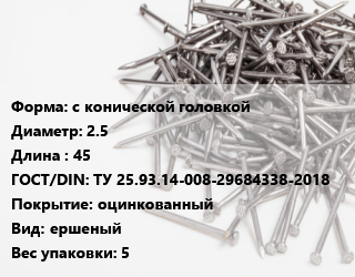 Гвоздь с конической головкой 2.5х45 ГОСТ: ТУ 25.93.14-008-29684338-2018 оцинкованный ершеный 5