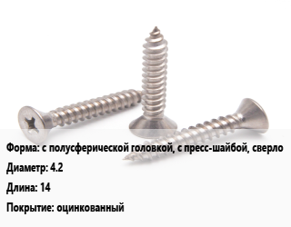 Саморез с полусферической головкой, с пресс-шайбой, сверло D=4.2 L=14 оцинкованный