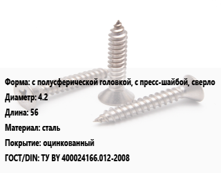 Саморез с полусферической головкой, с пресс-шайбой, сверло D=4.2 L=56 сталь оцинкованный ГОСТ: ТУ BY 400024166.012-2008