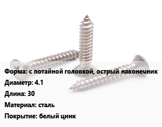 Саморез с потайной головкой, острый наконечник D=4.1 L=30 сталь белый цинк, кг, для оконного профиля цена от 389.89 ₽ / кг, где купить, условия доставки в Самаре и Самарской области