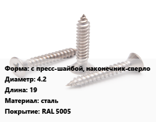 Саморез с пресс-шайбой, наконечник-сверло D=4.2 L=19 сталь RAL 5005, упаковка 1000 шт цена от 678.94 ₽ / кг, где купить, условия доставки в Самаре и Самарской области