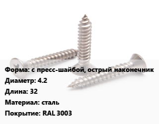 Саморез с пресс-шайбой, острый наконечник D=4.2 L=32 сталь RAL 3003, шт цена По запросу где купить, условия доставки в Самаре и Самарской области