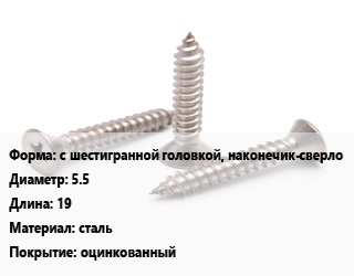 Саморез с шестигранной головкой, наконечик-сверло D=5.5 L=19 сталь оцинкованный, шт цена от 2.07 ₽ / кг, где купить, условия доставки в Самаре и Самарской области