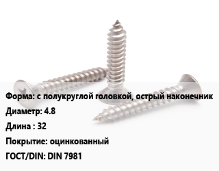 Саморез с полукруглой головкой, острый наконечник D=4.8 L=32 оцинкованный ГОСТ: DIN 7981