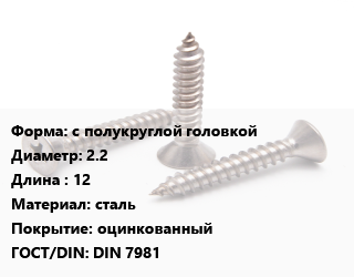 Саморез с полукруглой головкой D=2.2 L=12 сталь оцинкованный ГОСТ: DIN 7981, упаковка 1000 шт, Китай цена от 501.7 ₽ / кг, где купить, условия доставки в Самаре и Самарской области