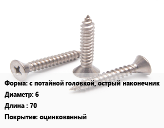 Саморез с потайной головкой, острый наконечник D=6 L=70 оцинкованный, шт цена от 3.53 ₽ / кг, где купить, условия доставки в Самаре и Самарской области