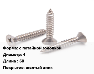 Саморез с потайной головкой D=4 L=60 желтый цинк, упаковка 20 шт цена от 62.1 ₽ / кг, где купить, условия доставки в Самаре и Самарской области