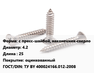 Саморез с пресс-шайбой, наконечник-сверло D=4.2 L=25 оцинкованный ГОСТ: ТУ BY 400024166.012-2008