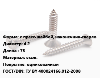 Саморез с пресс-шайбой, наконечник-сверло D=4.2 L=75 сталь оцинкованный ГОСТ: ТУ BY 400024166.012-2008, упаковка 1000 шт, РМЗ цена от 1 331 ₽ / кг, где купить, условия доставки в Самаре и Самарской области