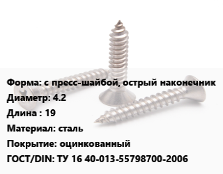 Саморез с пресс-шайбой, острый наконечник D=4.2 L=19 сталь оцинкованный ГОСТ: ТУ 16 40-013-55798700-2006