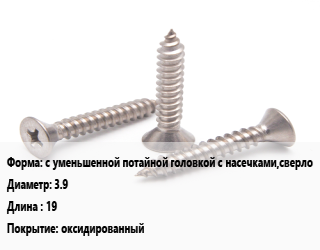 Саморез с уменьшенной потайной головкой с насечками,сверло D=3.9 L=19 оксидированный