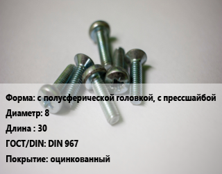 Винт с полусферической головкой, с прессшайбой 8х30 DIN 967 оцинкованный, упаковка, кг цена от 162.99 ₽ / кг, где купить, условия доставки в Самаре и Самарской области