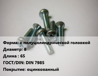 Винт с полуцилиндрической головкой 8х65 DIN 7985 оцинкованный, упаковка, кг цена от 107.1 ₽ / кг, где купить, условия доставки в Самаре и Самарской области