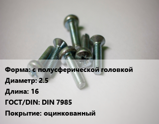Винт с полусферической головкой 2.5х16 DIN 7985 оцинкованный, цена за шт, кг цена По запросу где купить, условия доставки в Самаре и Самарской области