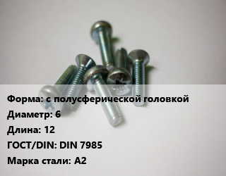 Винт с полусферической головкой 6х12 DIN 7985 Сталь: А2, цена за шт, кг цена от 9.91 ₽ / кг, где купить, условия доставки в Самаре и Самарской области