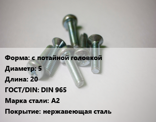 Винт с потайной головкой 5х20 DIN 965 Сталь: А2 нержавеющая сталь, цена за шт, кг цена от 5.67 ₽ / кг, где купить, условия доставки в Самаре и Самарской области