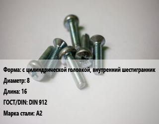 Винт с цилиндрической головкой, внутренний шестигранник 8х16 DIN 912 Сталь: А2, цена за шт, кг цена от 16.45 ₽ / кг, где купить, условия доставки в Самаре и Самарской области