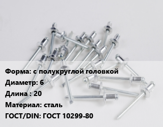 Заклепка с полукруглой головкой 6х20 сталь ГОСТ: ГОСТ 10299-80, кг цена от 214.89 ₽ / шт, где купить, условия доставки в Самаре и Самарской области