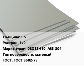 Лист нержавеющий 1.5 1х2 Сталь: 08Х18Н10, AISI 304 Тип:матовый ГОСТ 5582-75
